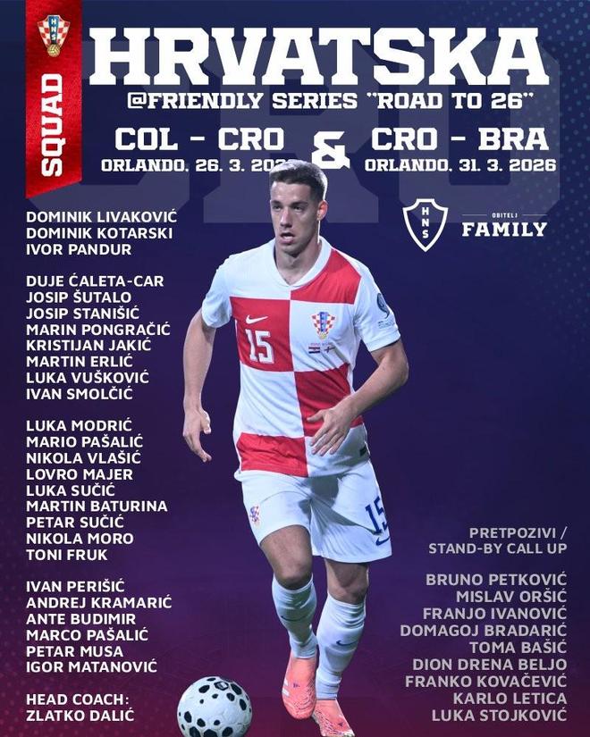 克罗地亚队新一期大名单: